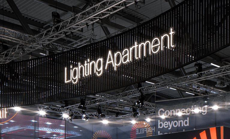 Leuchtschriften und Banner gliedern die einzelnen Themenbereiche.